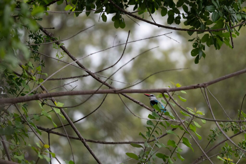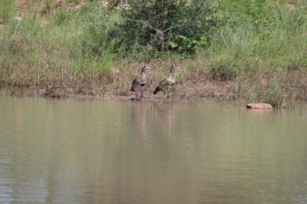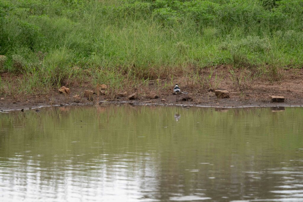 Hjemme på lodgen er en lille sø hvor de vilde dyr, og især de vilde fugle kommer og drikker og spiser. Her er en lille vadefugl; en trebåndet præstekrave (Three-banded Plover).